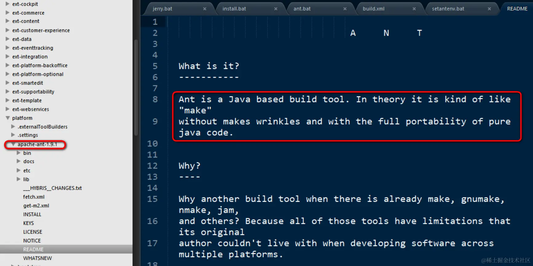 Ant 是一个 Apache 基金会下的跨平台的基于 Java 语言开发的构件工具。