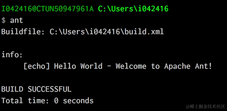 在存放该build.xml的目录下执行命令行ant, 看到如下输出: