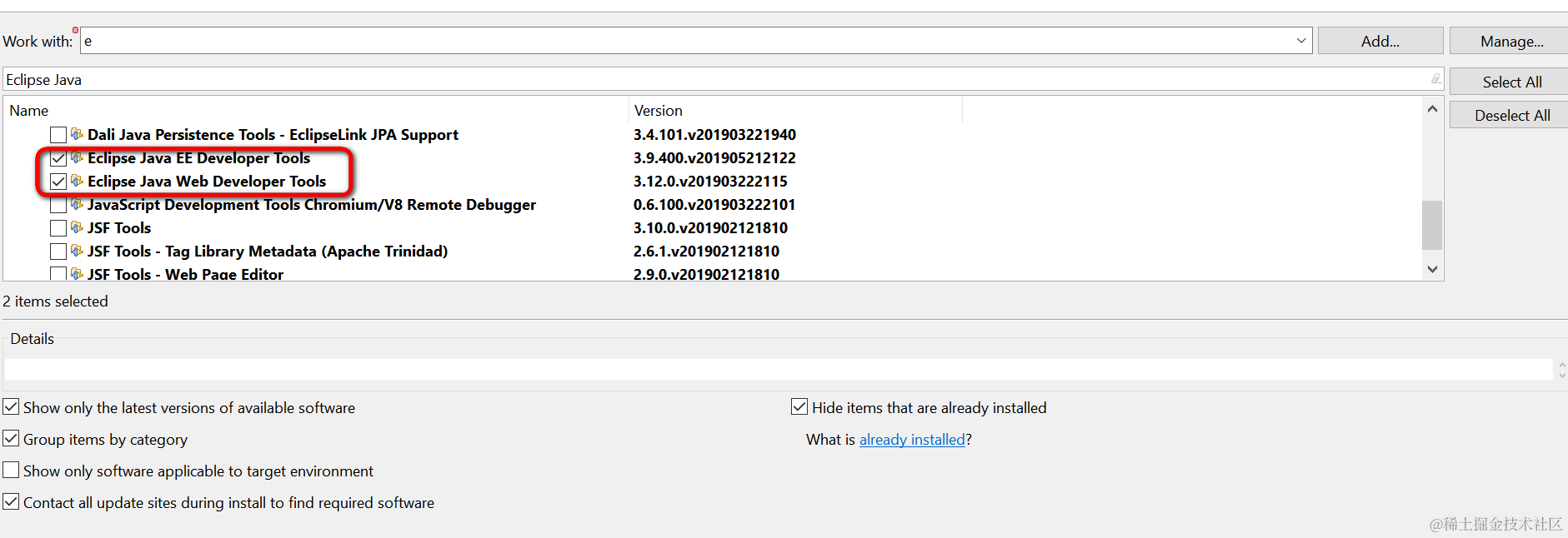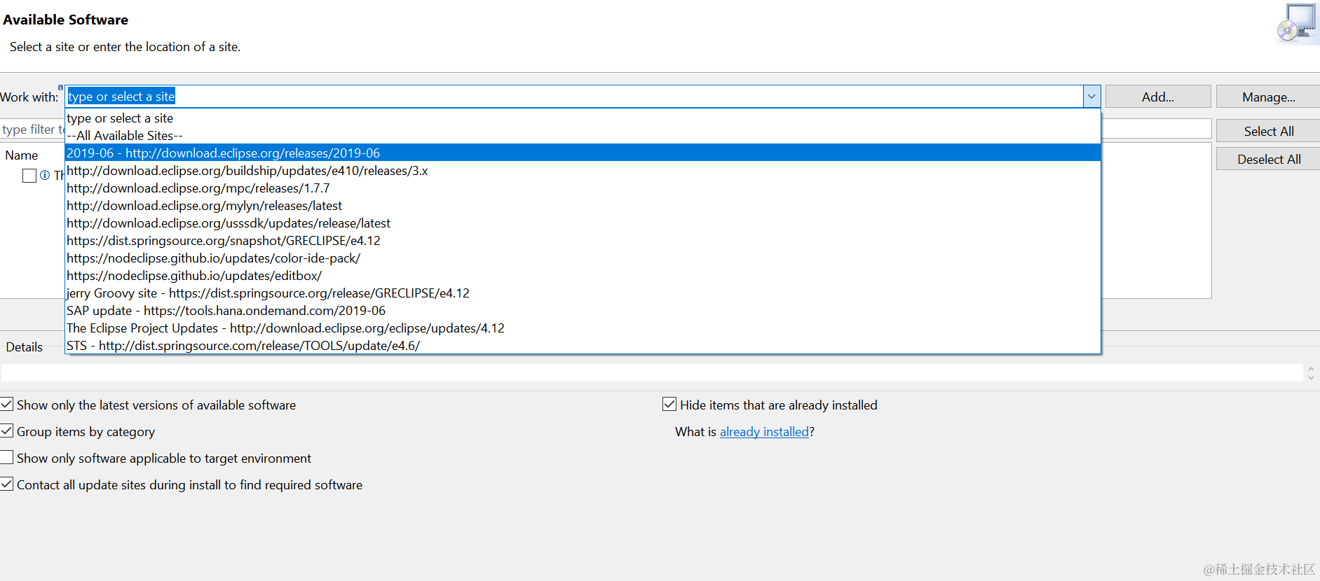 选择合适的Update site:download.eclipse.org/releases/20…