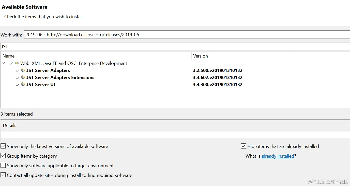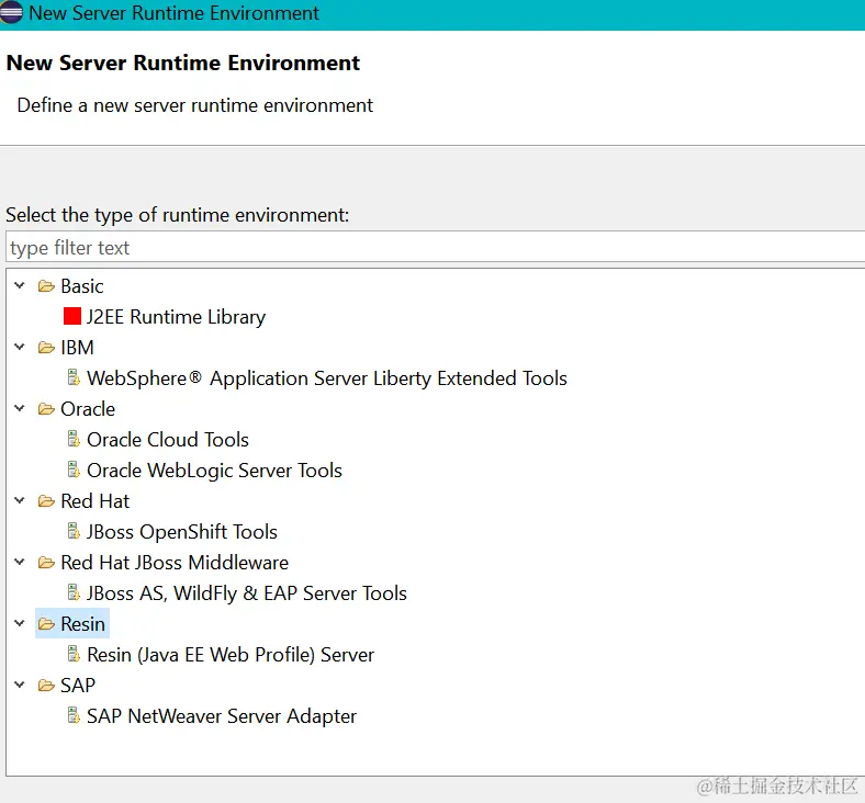 Eclipse Server runtime设置里找不到apache tomcat的处理方法 已注销 2021-04-26 408 阅读1分钟 我在Eclipse配置页面里试图新建一个Server runtime environment时,发现运行时环境列表里,没有Apache Tomcat的选项: 在Eclipse的install new software里,安装JST Server Adapters和JST Server Adapters Extensions: 安装之后问题解决: 要获取更多Jerry的原创文章,请关注公众号"汪子熙":