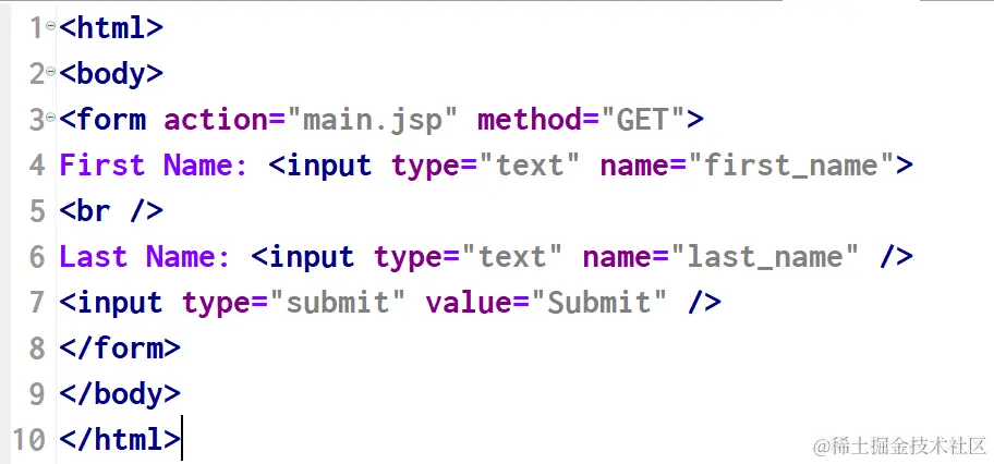 用form标签定义了一个表单,里面有两个input字段,用于输入first name和last name. 表单action属性为main.jsp, 点击类型为submit的input字段后,会向action指定的main.jsp发送一个HTTP请求。