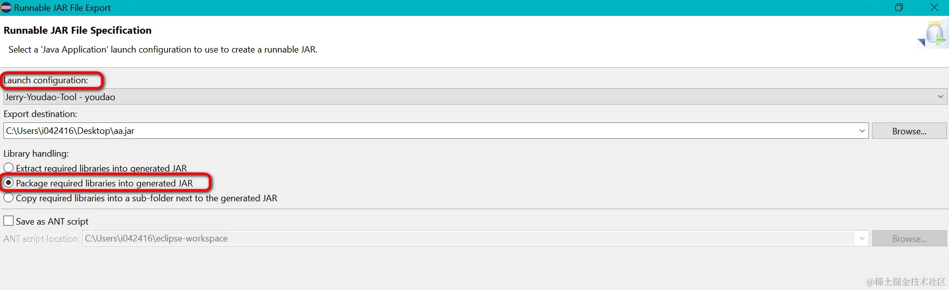 需要指定一个Launch configuration,以及打包时的库文件处理策略:package required libraries into generated JAR