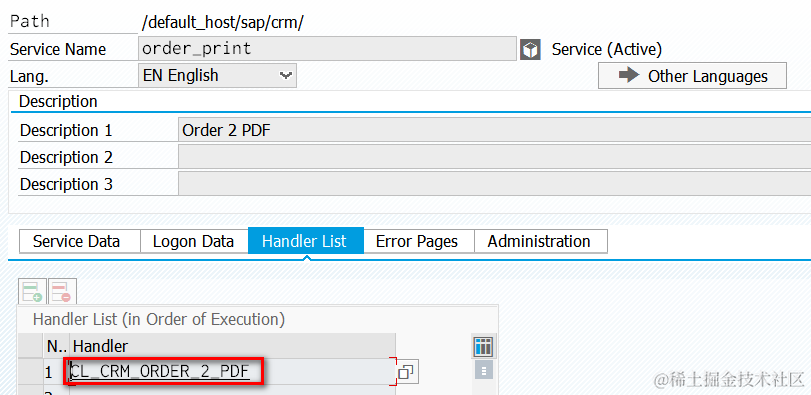 (4) In step 2, the ICF service /sap/crm/order_print is declared but not implemented, so we have to create it in this step via tcode SICF.