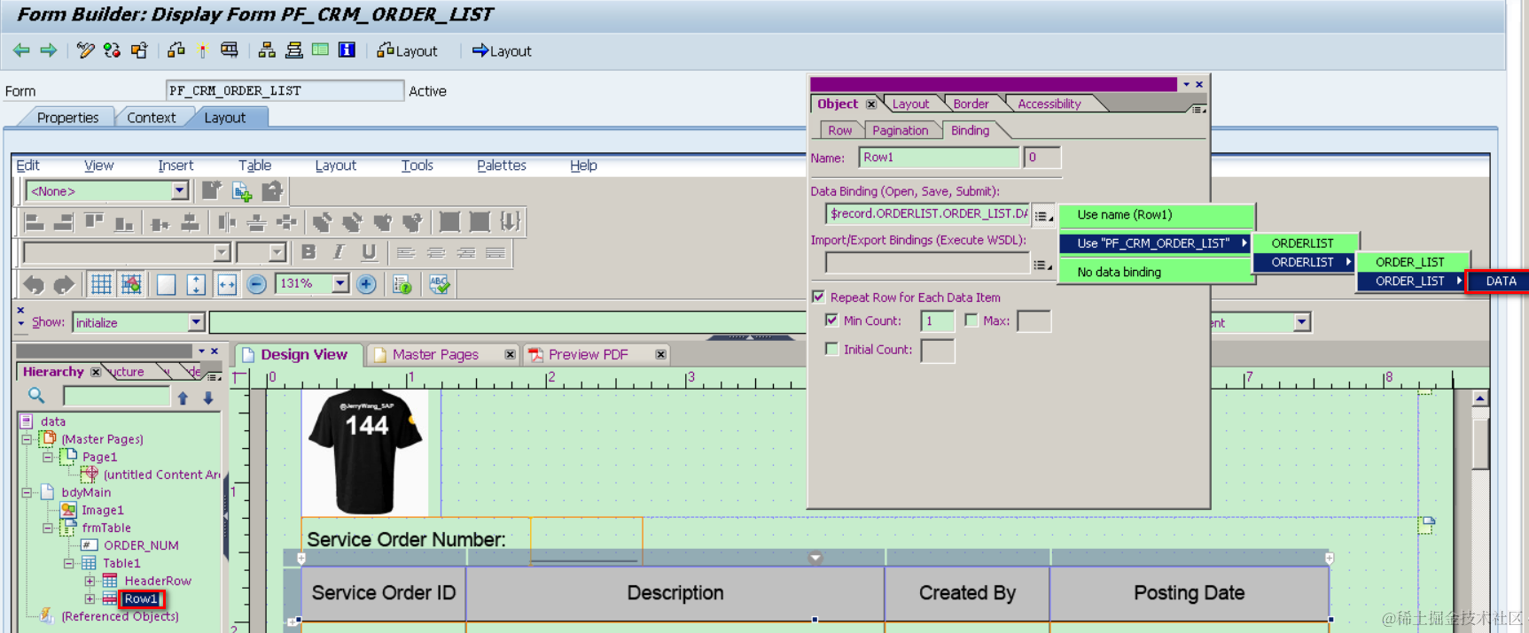 As in step 4, I use a SELECT * from CRMD_ORDERADM_H as the data source for this template, which means you can bind any field in ABAP structure CRMD_ORDERADM_H to the table cell in PDF, as illustrated below.