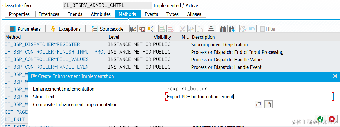 (1) Create a new post exit on class CL_BTSRV_ADVSRL_CNTRL, method PREPARE_TOOLBAR, in order to add a new button for PDF export in table toolbar.