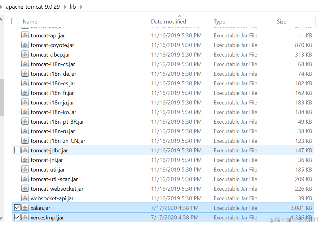 java.io.FileNotFoundException: C:\MyApp\apache-tomcat-9.0.29\lib\serializer.jar (The system cannot find the file specified)