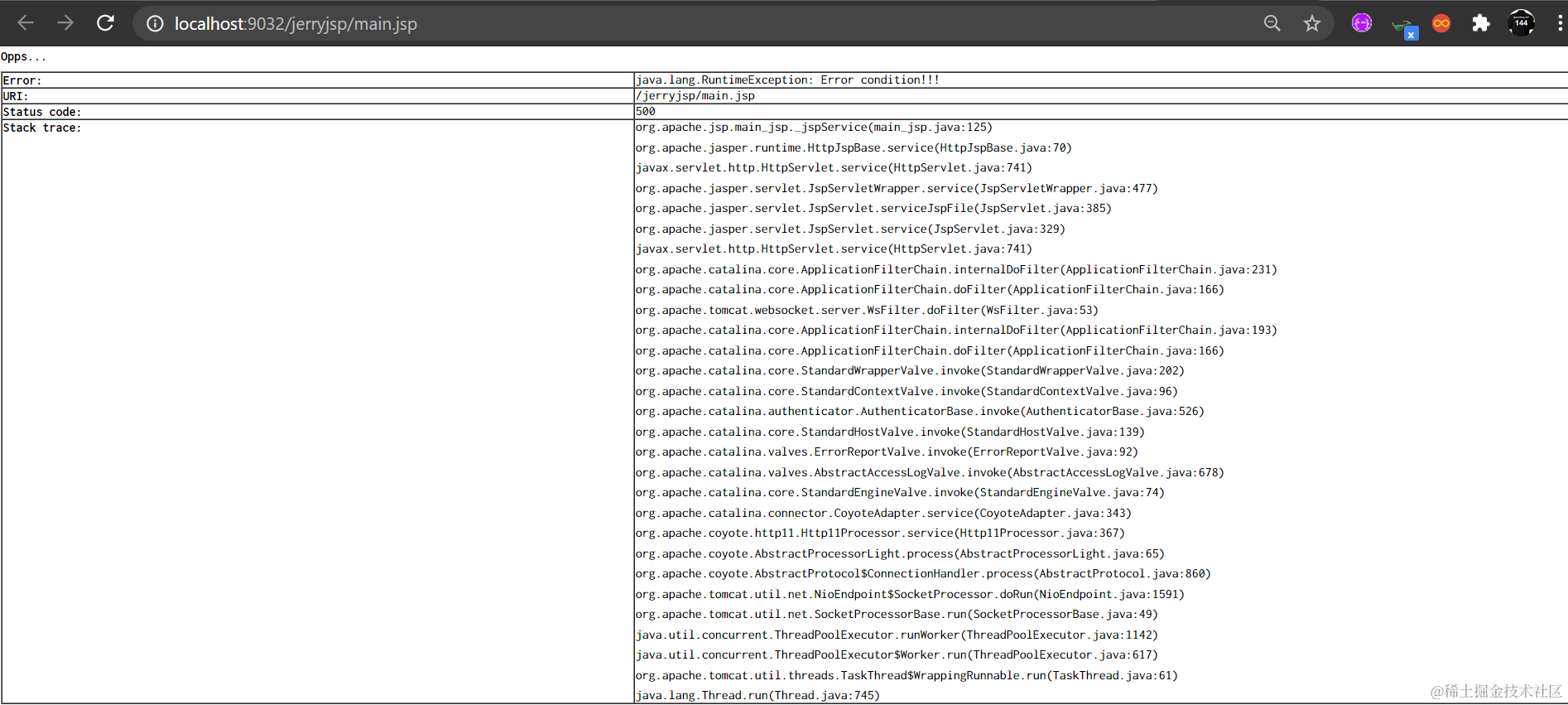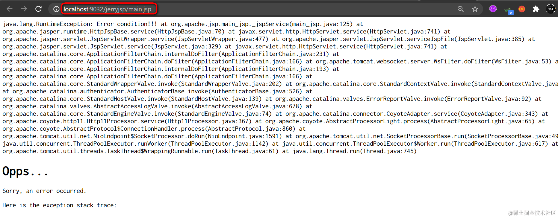 java.lang.RuntimeException: Error condition!!! at org.apache.jsp.main_jsp._jspService(main_jsp.java:125) at org.apache.jasper.runtime.HttpJspBase.service(HttpJspBase.java:70) at javax.servlet.http.HttpServlet.service(HttpServlet.java:741) at org.apache.jasper.servlet.JspServletWrapper.service(JspServletWrapper.java:477) at org.apache.jasper.servlet.JspServlet.serviceJspFile(JspServlet.java:385) at org.apache.jasper.servlet.JspServlet.service(JspServlet.java:329) at javax.servlet.http.HttpServlet.service(HttpServlet.java:741) at org.apache.catalina.core.ApplicationFilterChain.internalDoFilter(ApplicationFilterChain.java:231) at org.apache.catalina.core.ApplicationFilterChain.doFilter(ApplicationFilterChain.java:166) at org.apache.tomcat.websocket.server.WsFilter.doFilter(WsFilter.java:53) at org.apache.catalina.core.ApplicationFilterChain.internalDoFilter(ApplicationFilterChain.java:193) at org.apache.catalina.core.ApplicationFilterChain.doFilter(ApplicationFilterChain.java:166) at org.apache.catalina.core.StandardWrapperValve.invoke(StandardWrapperValve.java:202) at org.apache.catalina.core.StandardContextValve.invoke(StandardContextValve.java:96) at org.apache.catalina.authenticator.AuthenticatorBase.invoke(AuthenticatorBase.java:526) at org.apache.catalina.core.StandardHostValve.invoke(StandardHostValve.java:139) at org.apache.catalina.valves.ErrorReportValve.invoke(ErrorReportValve.java:92) at org.apache.catalina.valves.AbstractAccessLogValve.invoke(AbstractAccessLogValve.java:678) at org.apache.catalina.core.StandardEngineValve.invoke(StandardEngineValve.java:74) at org.apache.catalina.connector.CoyoteAdapter.service(CoyoteAdapter.java:343) at org.apache.coyote.http11.Http11Processor.service(Http11Processor.java:367) at org.apache.coyote.AbstractProcessorLight.process(AbstractProcessorLight.java:65) at org.apache.coyote.AbstractProtocol$ConnectionHandler.process(AbstractProtocol.java:860) at org.apache.tomcat.util.net.NioEndpoint$SocketProcessor.doRun(NioEndpoint.java:1591) at org.apache.tomcat.util.net.SocketProcessorBase.run(SocketProcessorBase.java:49) at java.util.concurrent.ThreadPoolExecutor.runWorker(ThreadPoolExecutor.java:1142) at java.util.concurrent.ThreadPoolExecutor$Worker.run(ThreadPoolExecutor.java:617) at org.apache.tomcat.util.threads.TaskThread$WrappingRunnable.run(TaskThread.java:61) at java.lang.Thread.run(Thread.java:745)