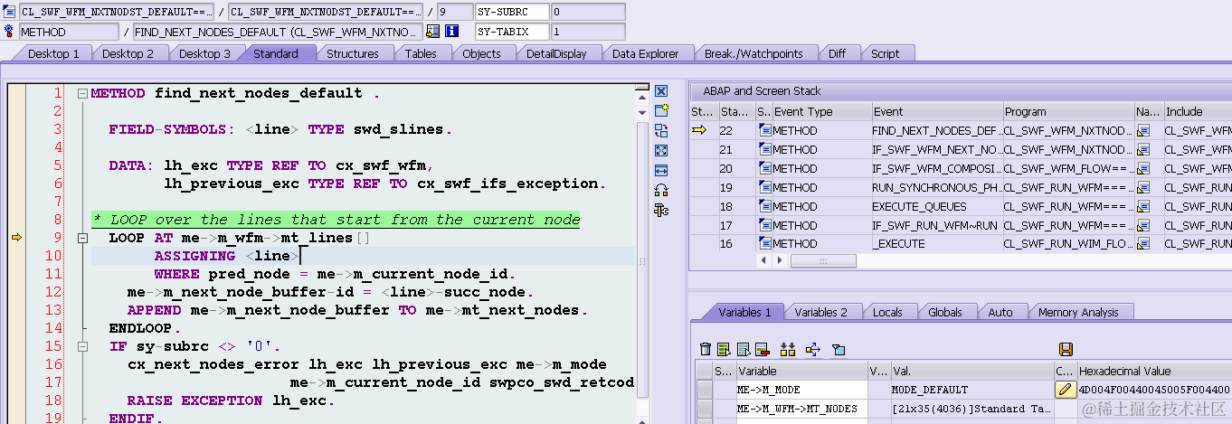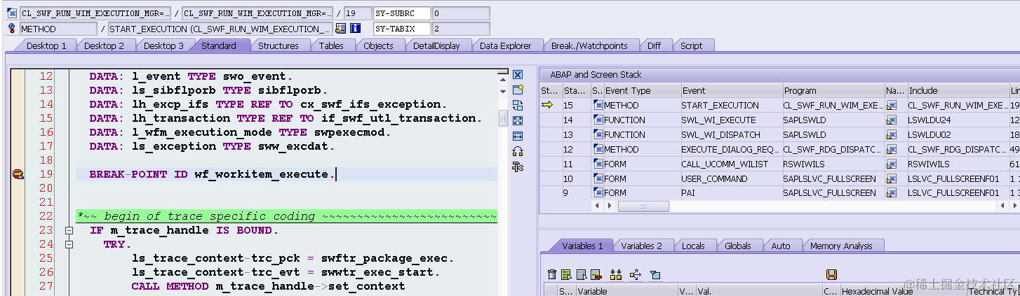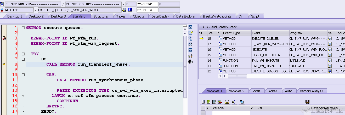 step2: step breakpoint on workflow framework method CL_SWF_RUN_WIM_EXECUTION_MGR~START_EXECUTIONS, CL_SWF_RUN_WFM~EXECUTE_QUEUES: