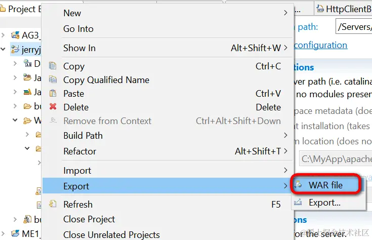 jsp项目手动导出成war包 已注销 2021-04-26 158 阅读1分钟 Eclipse里右键选择Export->War file: 打成的war包放到tomcat的webapps文件夹下,启动tomcat即可自动解压部署。 这个war包里的内容,用tree /F查看如下: 要获取更多Jerry的原创文章,请关注公众号"汪子熙":