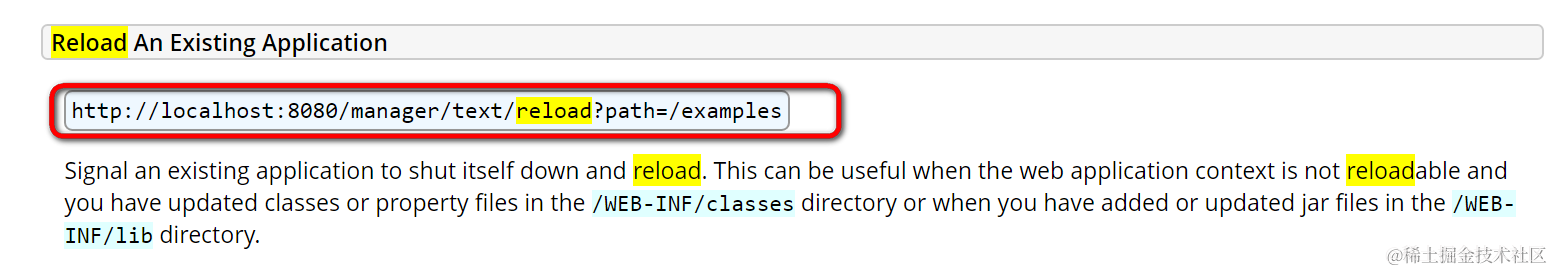 而如果想使用catalina-ant.jar调用ant来通过命令行的方式reload应用,使用的url应该是http://localhost:8080/manager/text/reload?path=/examples,而不是http://localhost:8080/manager/html/reload?path=/examples,一定要注意!