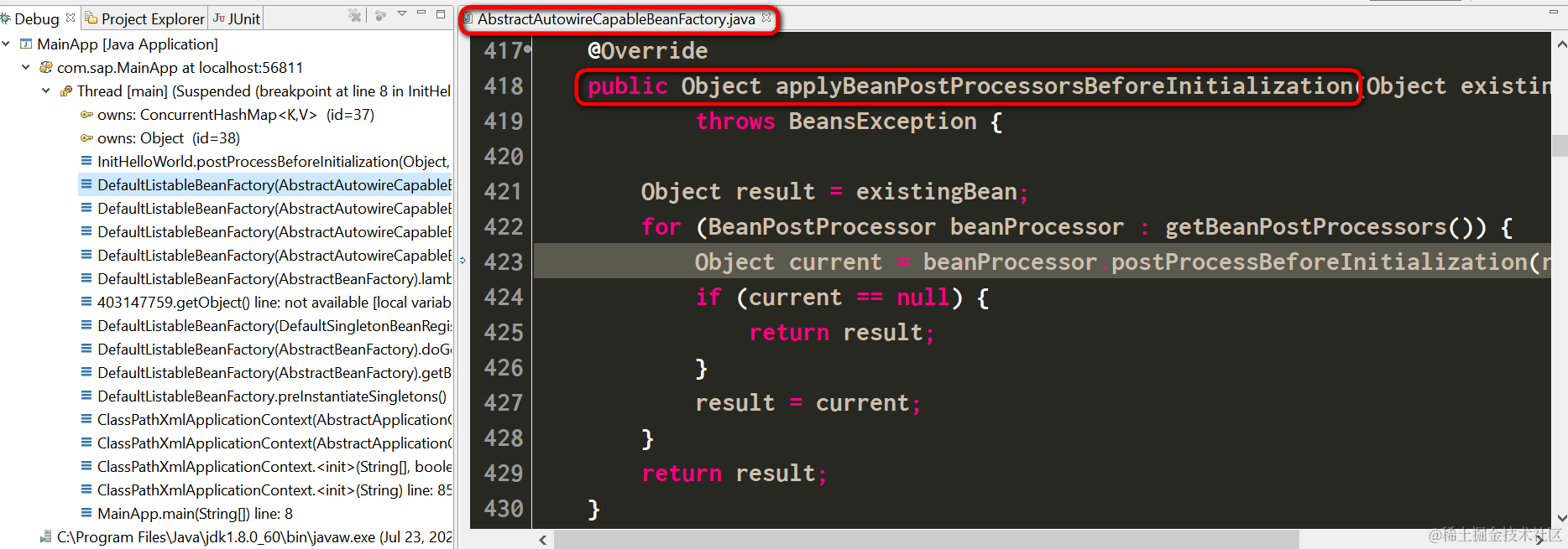 创建Spring IOC容器时,如果检测到PostProcessor,就调用其postProcessBeforeInitialization和postProcessAfterInitialization方法: