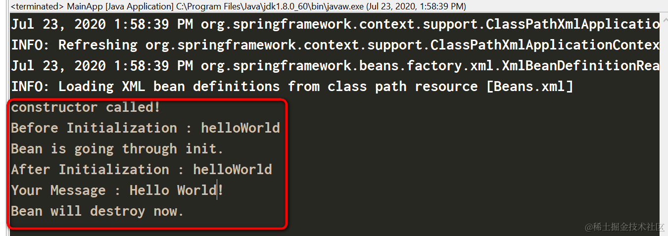 看个非常简单的例子:在任何 bean 的初始化的之前和之后输入该 bean 的名称: