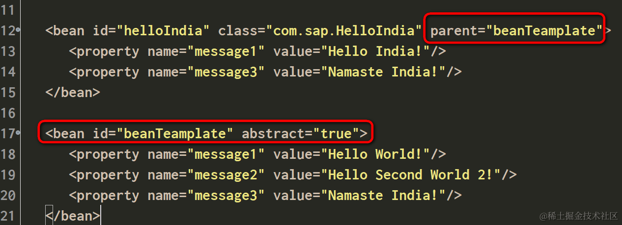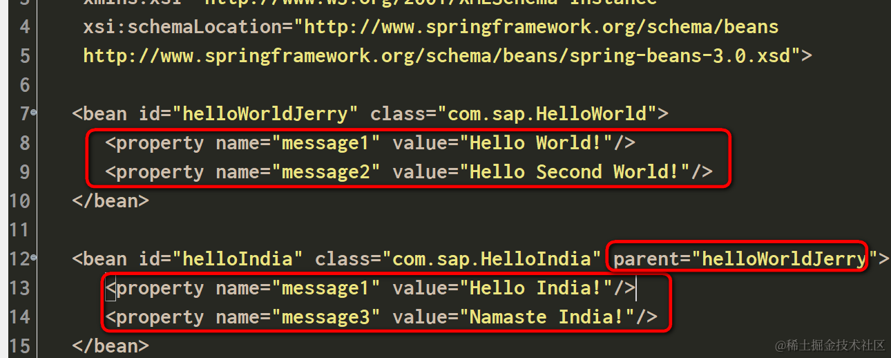 <bean id="helloIndia" class="com.sap.HelloIndia" parent="helloWorldJerry">