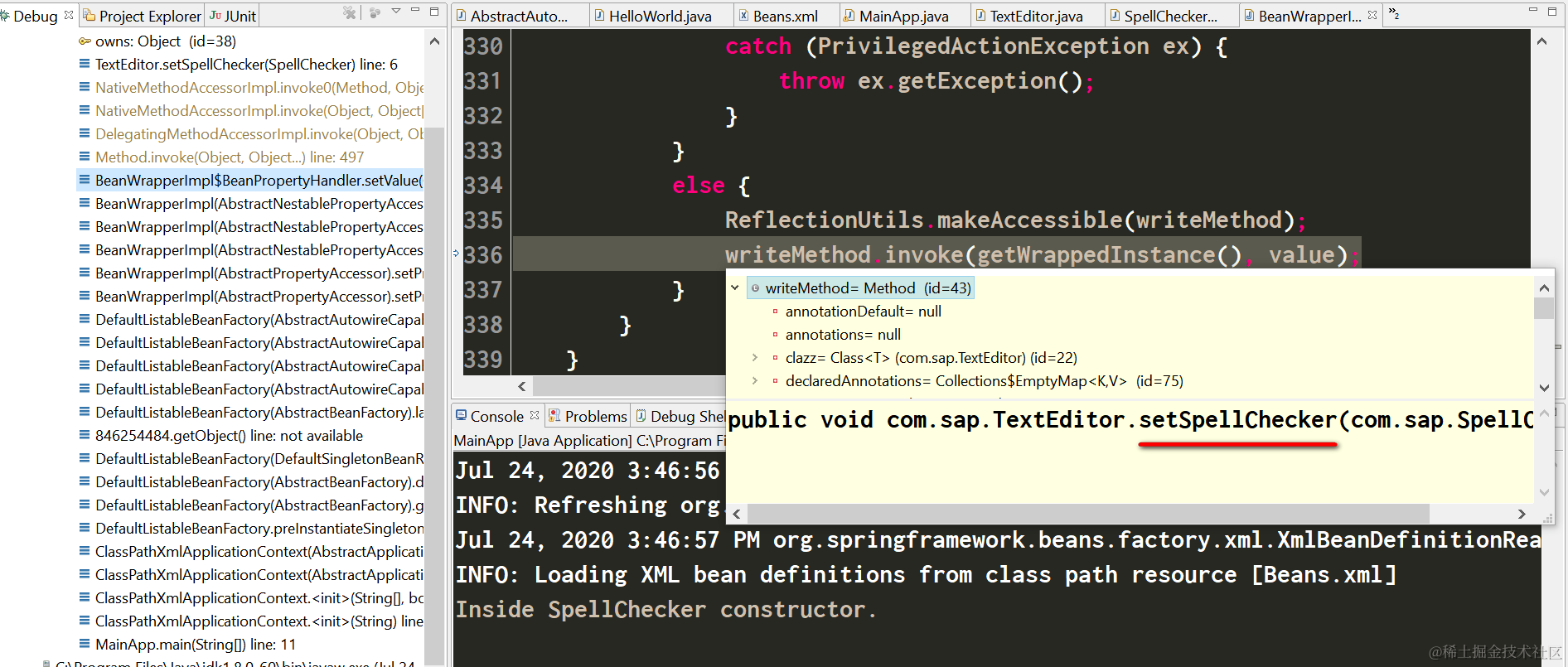 将setSpellChecker改成SetSpellChecker,就会遇到异常:org.springframework.beans.NotWritablePropertyException: Invalid property ‘spellChecker’ of bean class [com.sap.TextEditor]: Bean property ‘spellChecker’ is not writable or has an invalid setter method. Does the parameter type of the setter match the return type of the getter?