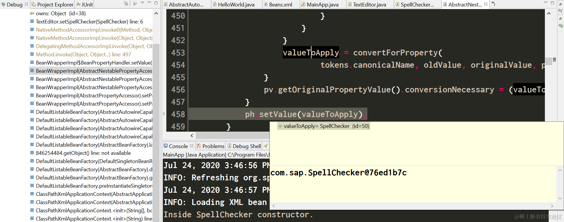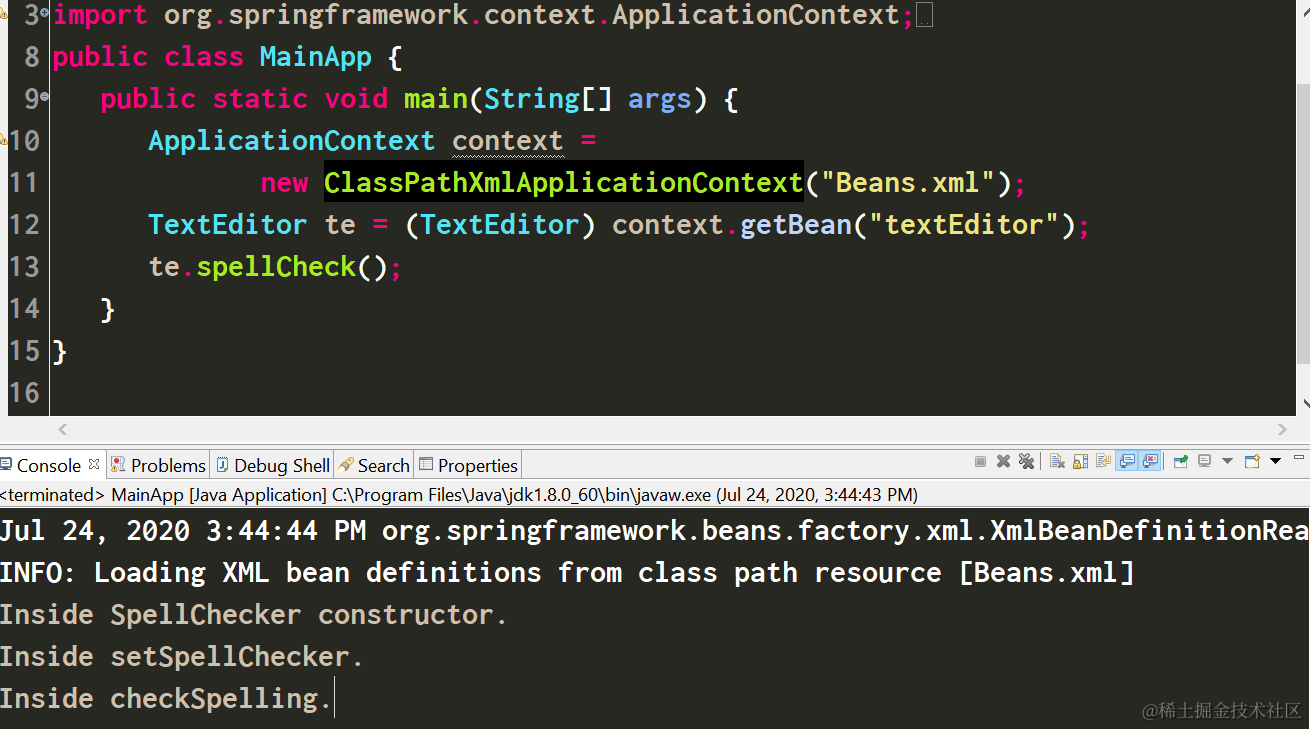 Exception in thread "main" org.springframework.beans.factory.BeanCreationException: Error creating bean with name 'textEditor' defined in class path resource [Beans.xml]: Error setting property values; nested exception is org.springframework.beans.NotWritablePropertyException: Invalid property 'spellChecker' of bean class [com.sap.TextEditor]: Bean property 'spellChecker' is not writable or has an invalid setter method. Does the parameter type of the setter match the return type of the getter?