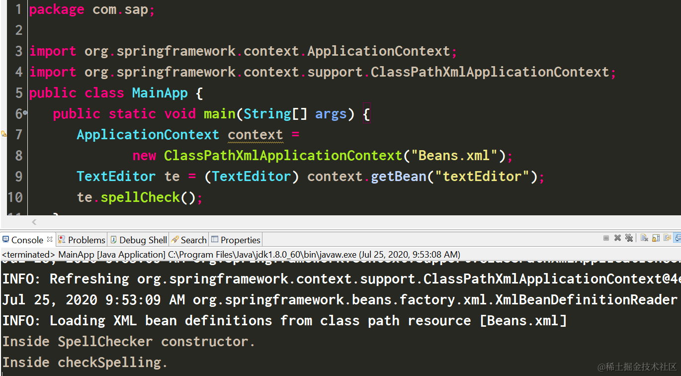 如果把beans.xml的SpellChecker的ID改为SpellChecker2,则运行时会报NullPointerException: