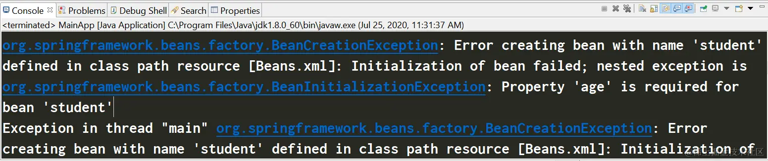 按照上述的beans.xml执行应用,会遇到下列错误:Property ‘age’ is required for bean ‘student’
