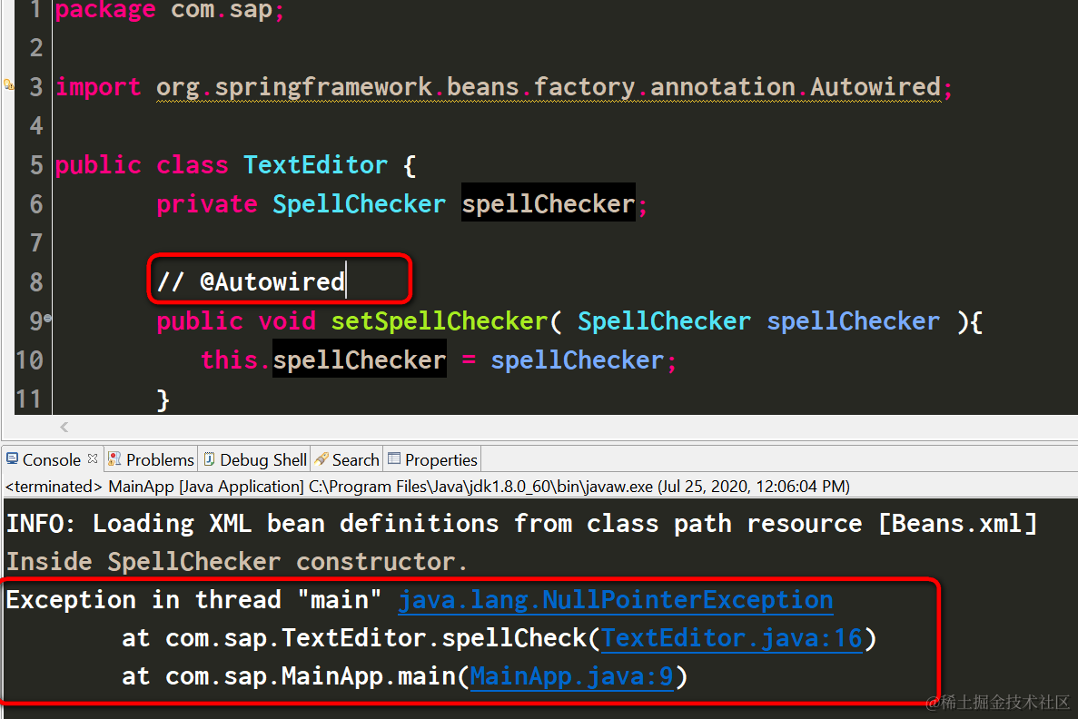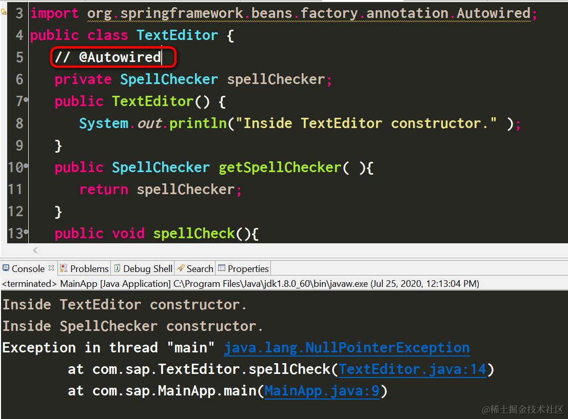 删除了Setter方法的@Autowired注释后,TextEditor的spellChecker注入不会发生,因此应用会发生nullpointer异常。