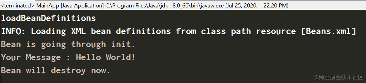 为了定义一个 bean 的安装和卸载,我们使用 init-method 和/或 destroy-method 参数简单的声明一下 。init-method 属性指定了一个方法,该方法在 bean 的实例化阶段会立即被调用。同样地,destroy-method 指定了一个方法,该方法只在一个 bean 从容器中删除之前被调用。