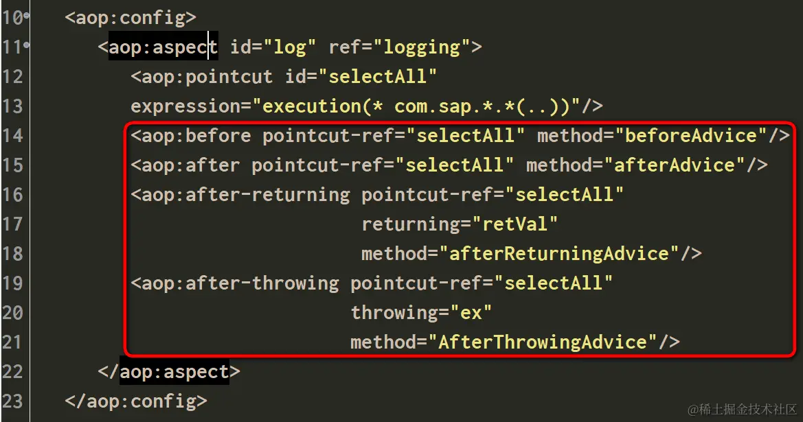 pointcut:连接点,指定哪些切入点应该被执行。ID为selectAll,结合expression表达式属性,说明期望logging的逻辑被织入所有advice并执行。
