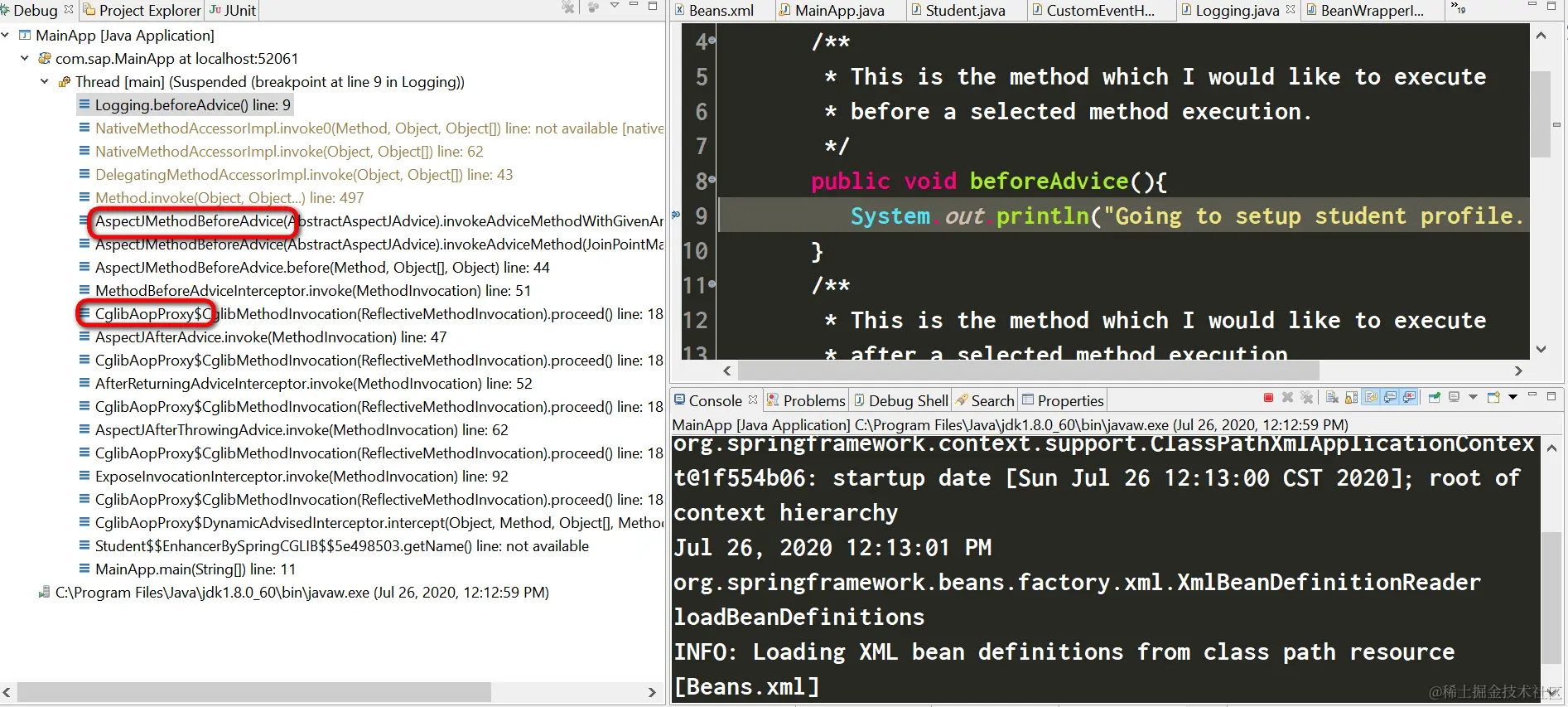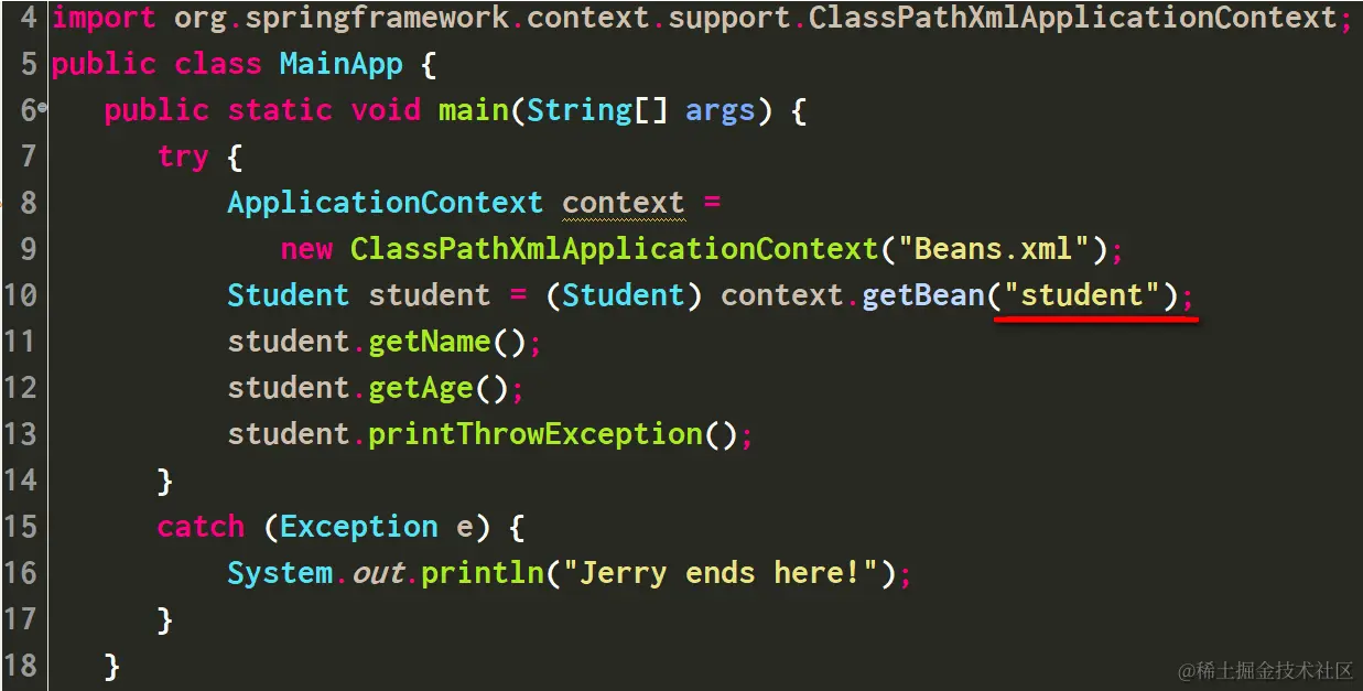 业务代码就是Student Bean:在这个MainApp.java里,调用了Student Bean的两个方法:getName和getAge. 我期望Logging类里定义的四个方法,可以被AOP织入。