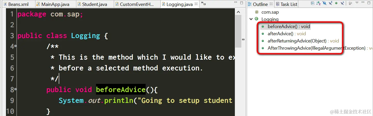 (3) 在com.sap.*下的所有bean的方法执行之前,执行logging bean的beforeAdvice方法。以此类推,在com.sap.*下的所有bean的方法执行之后但尚未返回时,执行logging bean的afterAdvice方法。