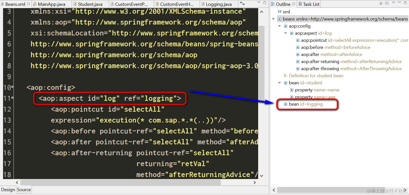 (2) 定义一个aspect,ref属性指向logging Bean: