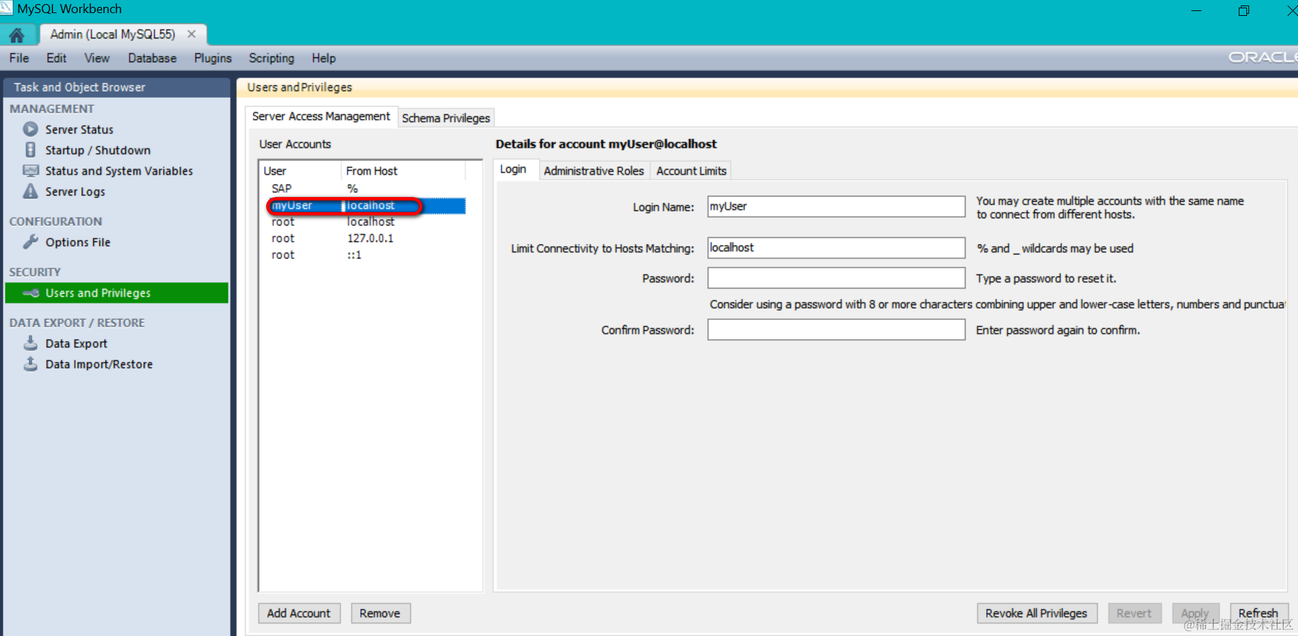 之后即可在mySQL workbench里看见这个新建的user: