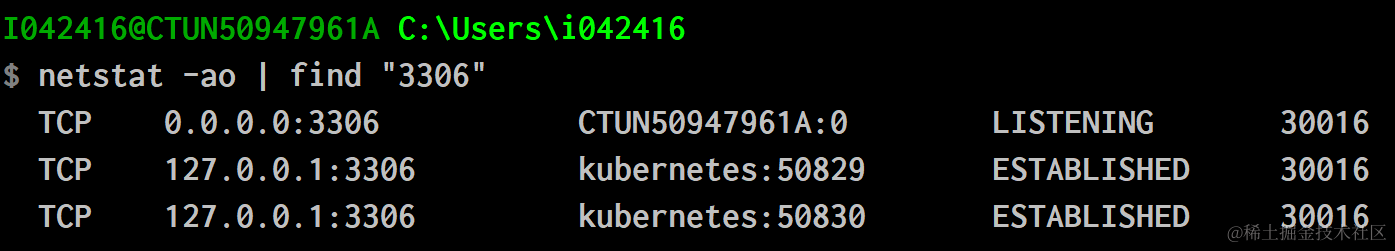 命令行netstat -ao | find “3306”, 查看MySQL默认端口号3306对应的进程id(pid)为30016: