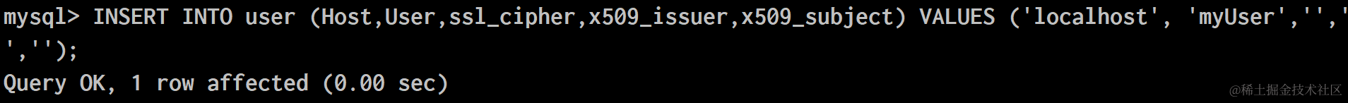 INSERT INTO user (Host,User,ssl_cipher,x509_issuer,x509_subject) VALUES ('localhost', 'myUser','','','');