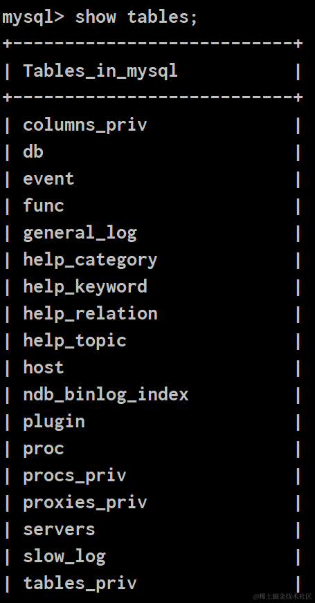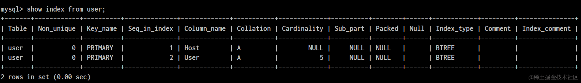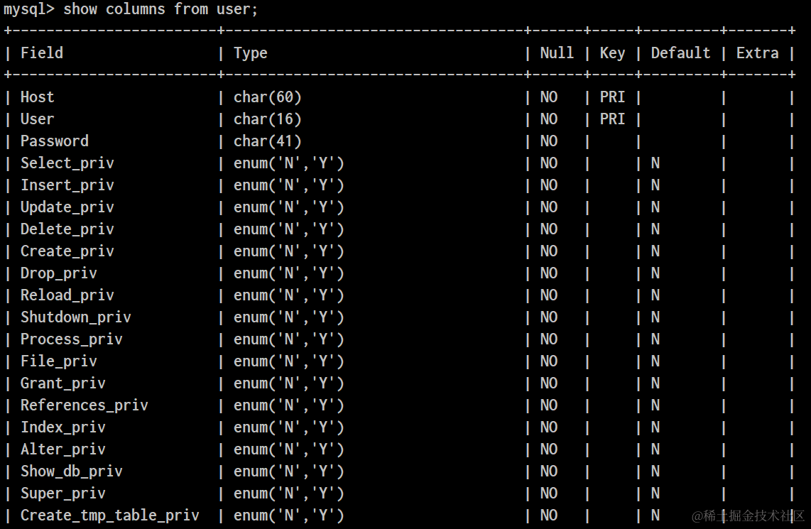 mySQL初学者一些最常用的命令行 已注销 2021-04-26 175 阅读1分钟 show databases; 查看当前的数据库列表 use mysql; 进入某一个数据库 show tables; 查看当前数据库下所有的数据库表 show columns from user; 查看user数据库表的行定义 show index from user; 查看user数据库表的索引信息 SHOW TABLE STATUS LIKE ‘user%’\G 要获取更多Jerry的原创文章,请关注公众号"汪子熙":