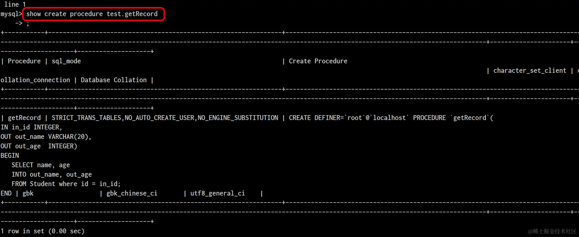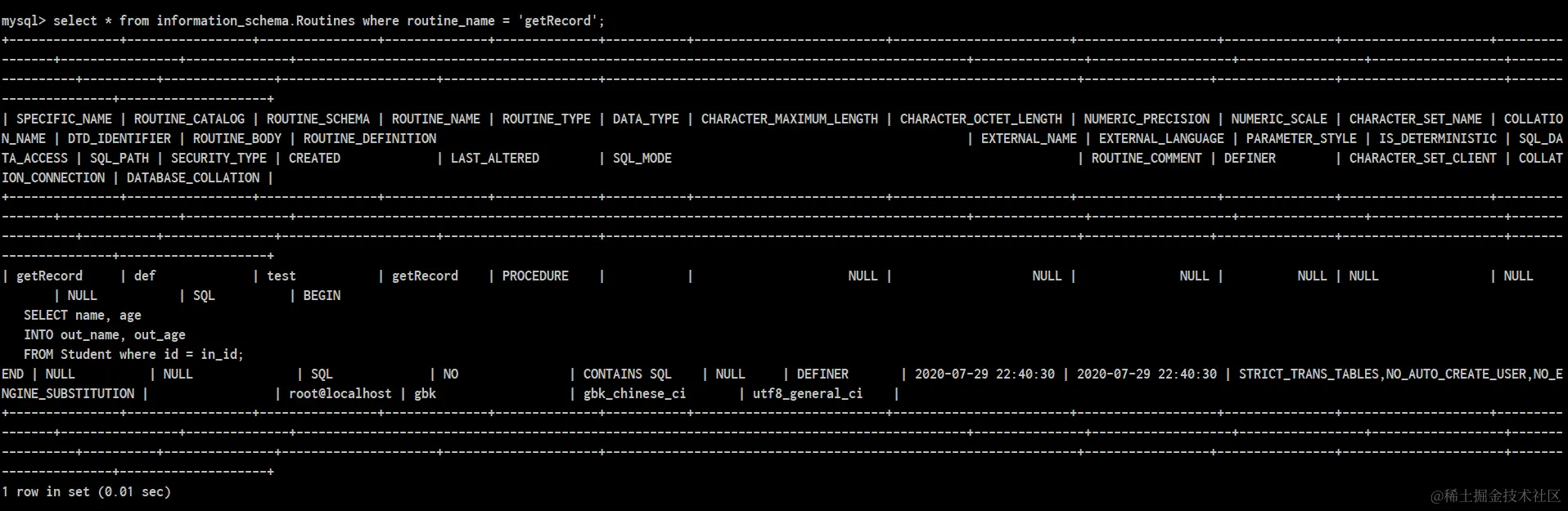 MySQL里的information_schema.Routines这张表类似SAP ABAP里的TADIR(对象注册表),所以我们也可以查询该表里对应的存储过程的记录: