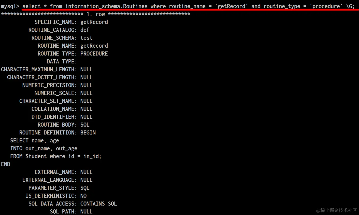 select * from information_schema.Routines where routine_name = ‘getRecord’ and routine_type = ‘procedure’ \G;
