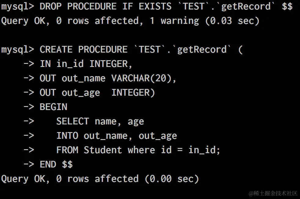 这个存储过程接受学生ID为输入,输出为学生的名字和年龄,实现一个简单的查询功能。
