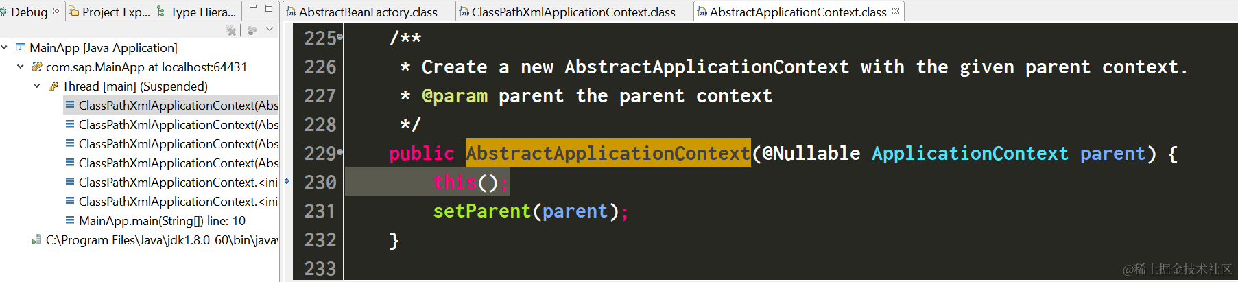 Java Spring初学者之调试器里括号包含的类含义 已注销 2021-04-26 50 阅读1分钟 如图: 表示在执行类的构造函数。 圆括号里代表执行的构造函数是定义在哪个实际类里的: 从继承树可以看出,ClassPathXmlApplicationContext最终的父类为AbstractApplicationContext: 要获取更多Jerry的原创文章,请关注公众号"汪子熙":