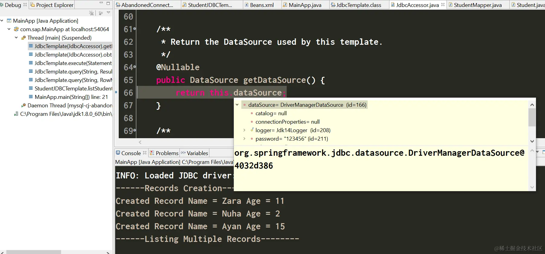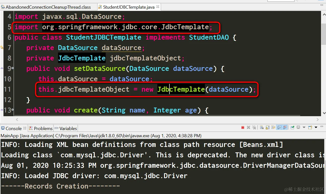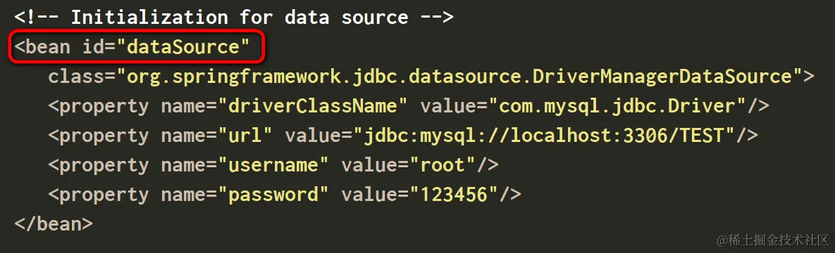 然后传入jdbcTemplateObject, 后者基于一个定义在Beans.xml里的bean创建的: