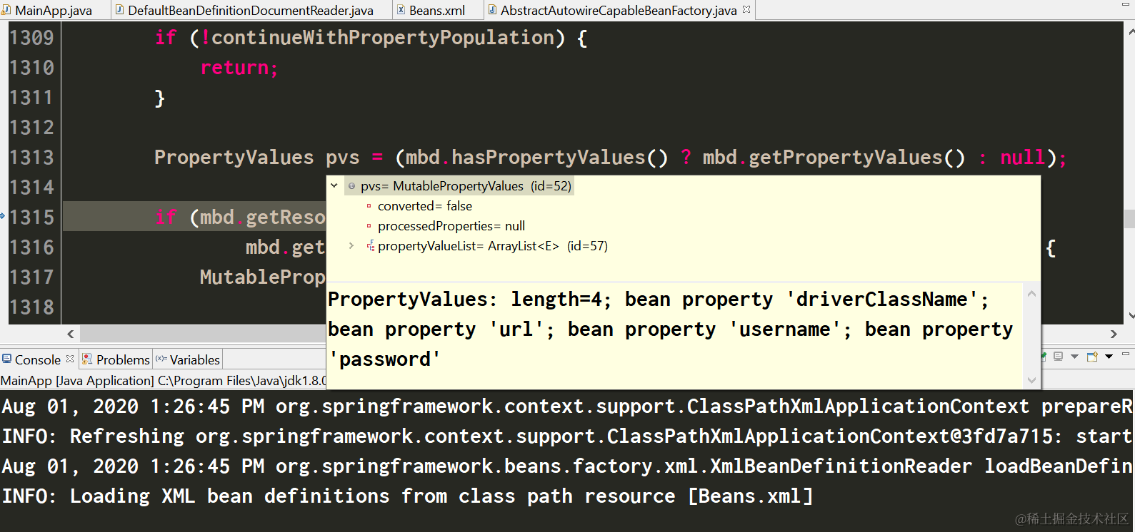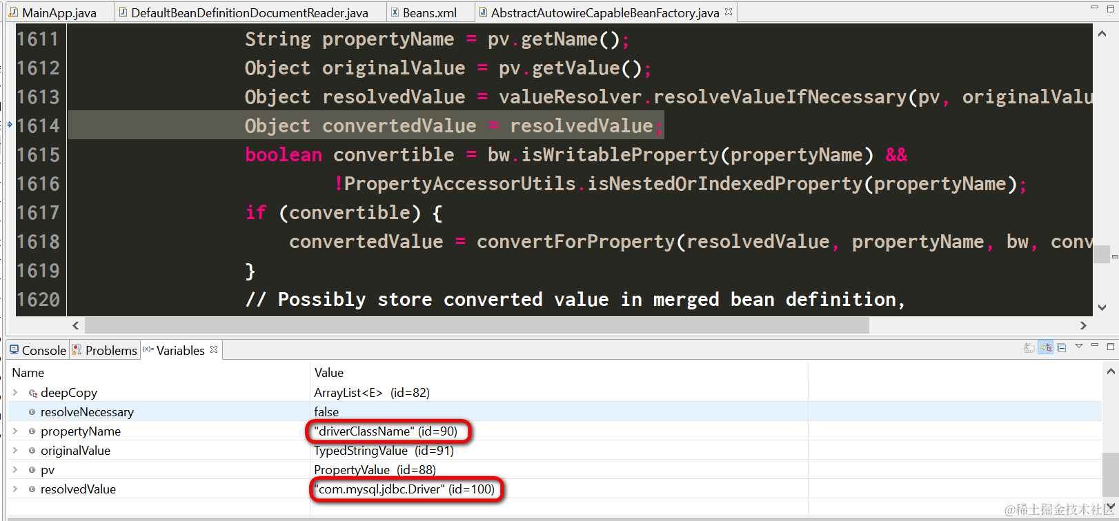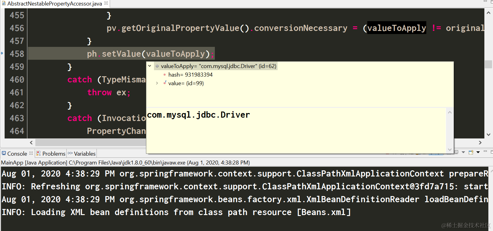 一旦populateBean方法执行完毕之后,Loaded JDBC driver:com.mysql.jdbc.Drive的消息就打印出来了: