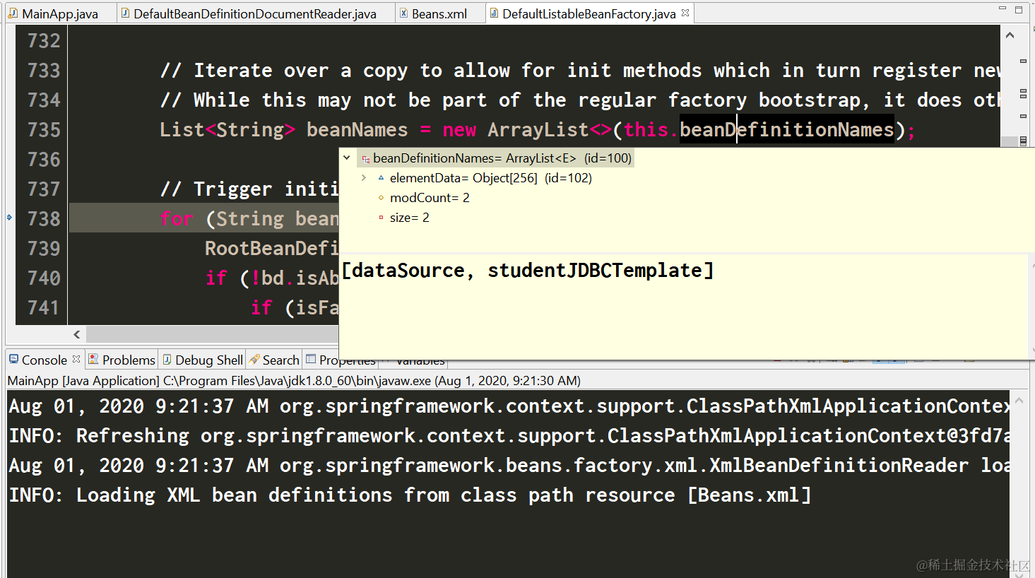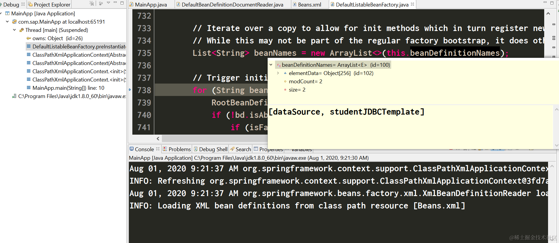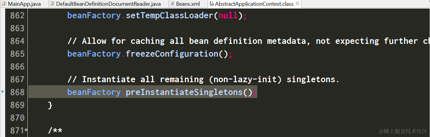 通过调试,发现AbstractApplicationContext的finishBeanFactoryInitialization方法执行完之后,INFO: Loaded JDBC driver: com.mysql.jdbc.Driver就打印了出来: