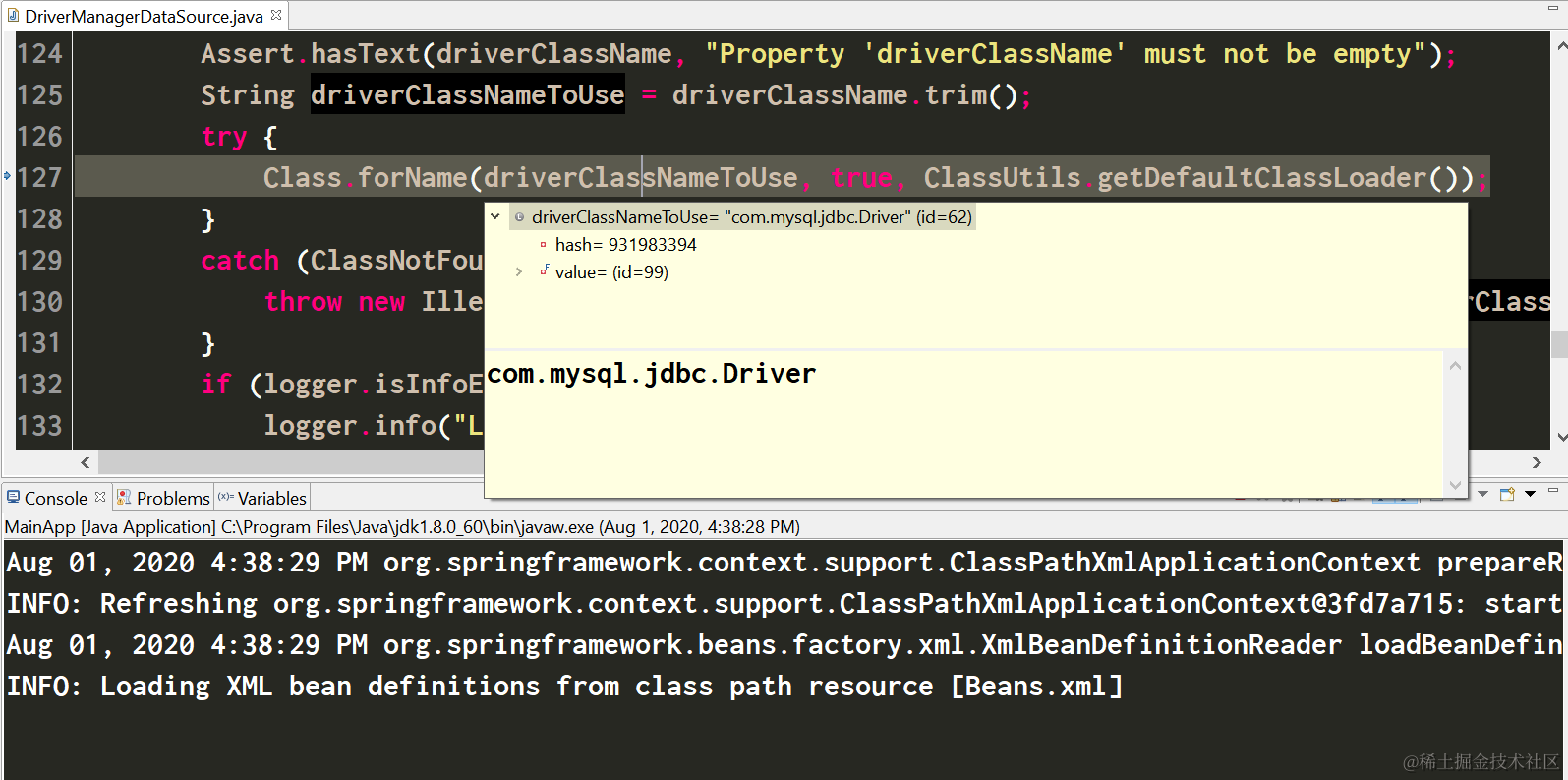 在第127行进行加载:Class.forName(driverClassNameToUse, true, ClassUtils.getDefaultClassLoader());