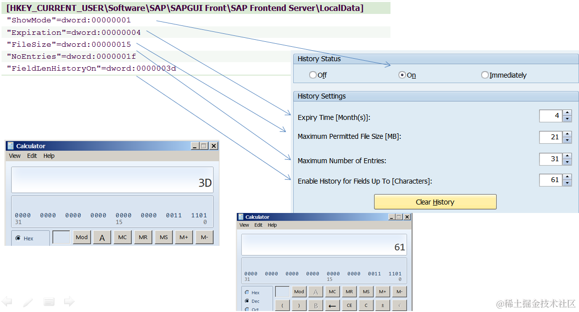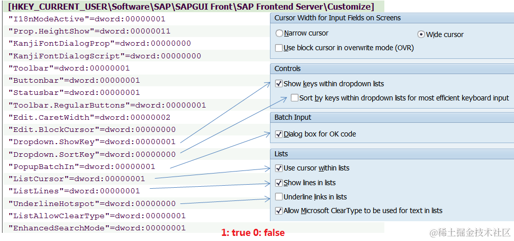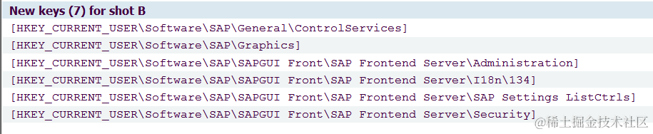The basic idea is to export the registry as a snapshot before SAP GUI setting is changed, let’s say before change snapshot. And change some settings or do something via SAP GUI, and export the registry again let’s say as a after change snapshot. Compare the two, the difference what you are looking for.