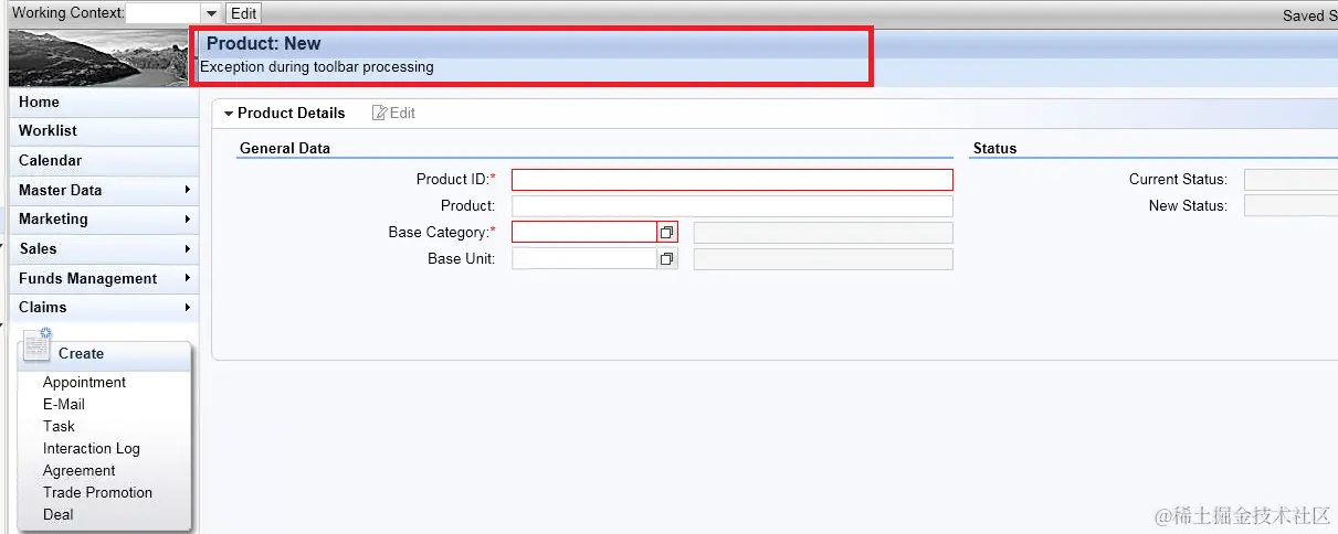 The strange thing is, after button is clicked, I didn’t see the expected new product creation page. Instead, I saw the weird page below: the whole UI area almost kept unchanged except the page title changed from “Search:Products” to “Product: New”. Why the left product creation page failed to be rendered???