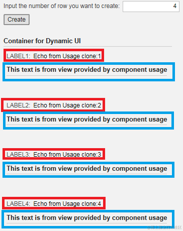 after you specify the number of rows you want to generate and click the create button, all UI elements and context node attribute will be generated in the runtime. The UI elements marked in blue come from the interface view of another component, and this view embedding logic is also done dynamically in the runtime.
