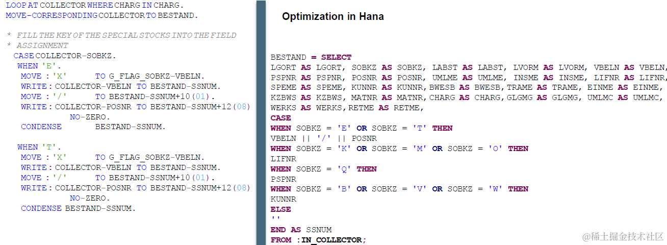 By the way, here below is a slide which talks about the optimization on two ERP transaction in HANA. There are several kinds of optimization categories and one of them also uses the similar syntax described in this blog: