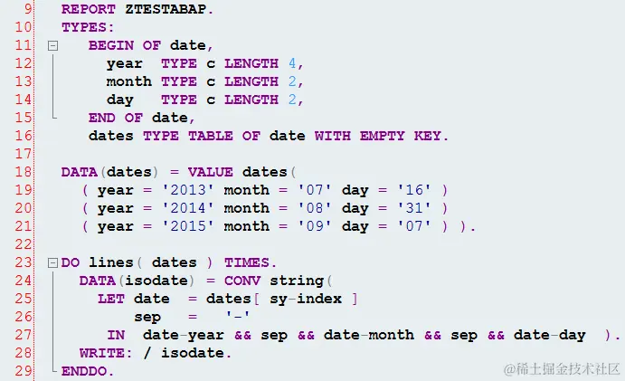 - finally the value of LET expression will be calculated and filled to inline variable isodate defined in line 24. We use CONV string to explicitly specify that inline defined variable isodate has type STRING.
