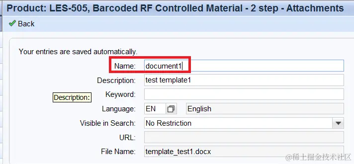 Click the Properties hyperlink, and we can change the document name from “template_test1” to “document1”: