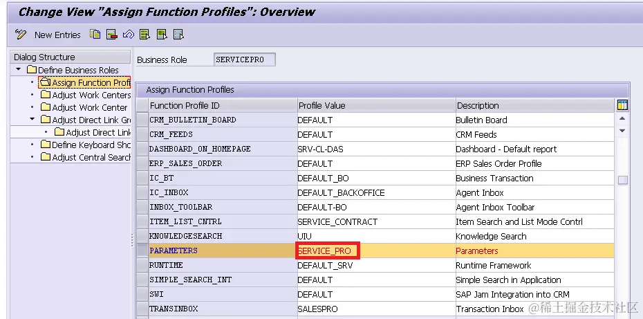 In SPRO Customer Relationship Management->UI Framework->Business Roles->Define Business Role, find the value of function profile PARAMETERS: SERVICE_PRO.