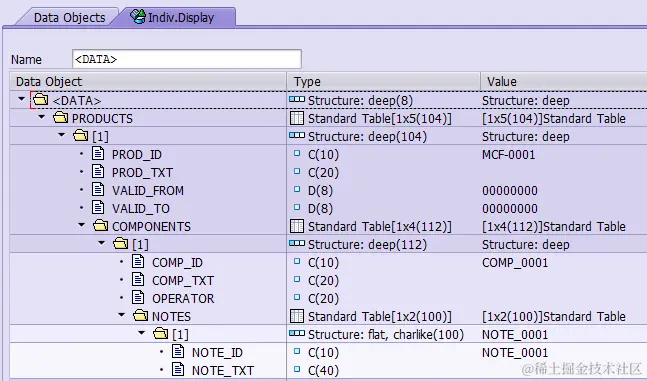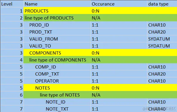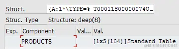 The variable could have the component named “PRODUCTS” which is a table type, the table line type is a structure with five fields: PROD_ID, PROD_TXT, VALID_FROM, VALID_TO and COMPONENTS. The last field COMPONENTS is again a table type, with the table line type consisting of four fields COMP_ID, COMP_TXT, OPERATOR and again a table type for last field NOTES.