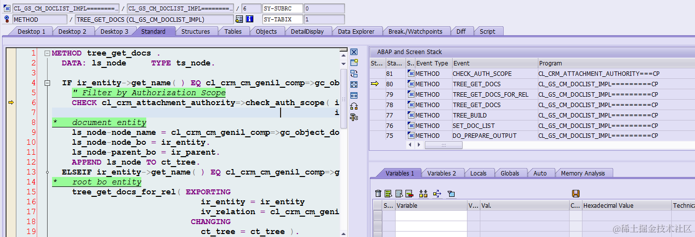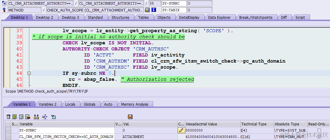 For authorization domain, you should use exactly the same spelling as “ATTACHMENT”, as is defined in constant CL_CRM_SFW_ITSM_SWITCH_CHECK=>gc_auth_domain. And just use SAP predefined class CL_CRM_AUTH_SCOPE_STATIC_CHK.