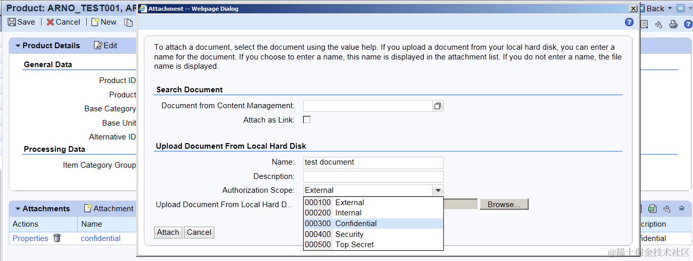 In the runtime, the authorization domain “ATTACHMENT” together with the authorization scope of current attachment will be evaluated by the view controller of attachment assignment block view: if authorization check fails for current user, the attachment being evaluated will not appear in the attachment assignment block.