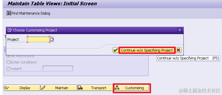(1) use tcode SM30, click customizing button. In the pop up dialog, click “Continue w/o Specifying Project”: